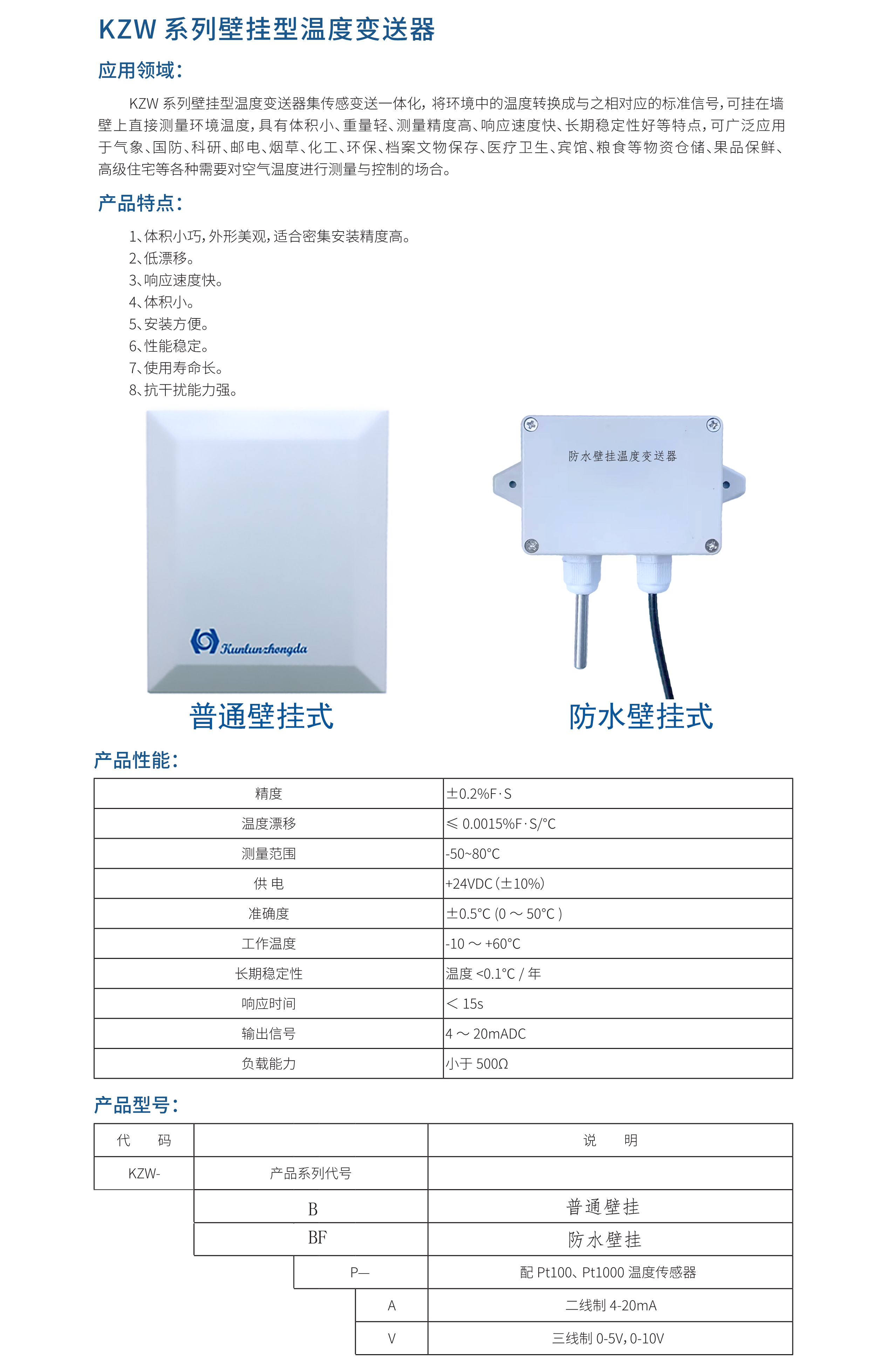 KZW系列壁挂型温度变送器,将环境中的温度转换成与之相对应的标准信号,可挂在墙壁上直接测量环境温度,具有体积小、重量轻、测量精度高、响应速度快、长期稳定性好等特点,应用于气象、国防、科研、邮电、烟草、化工、环保、档案文物保存、医疗卫生、宾馆、粮食等物资仓储、果品保鲜、住宅等各种需要对空气温度进行测量与控制的场合。